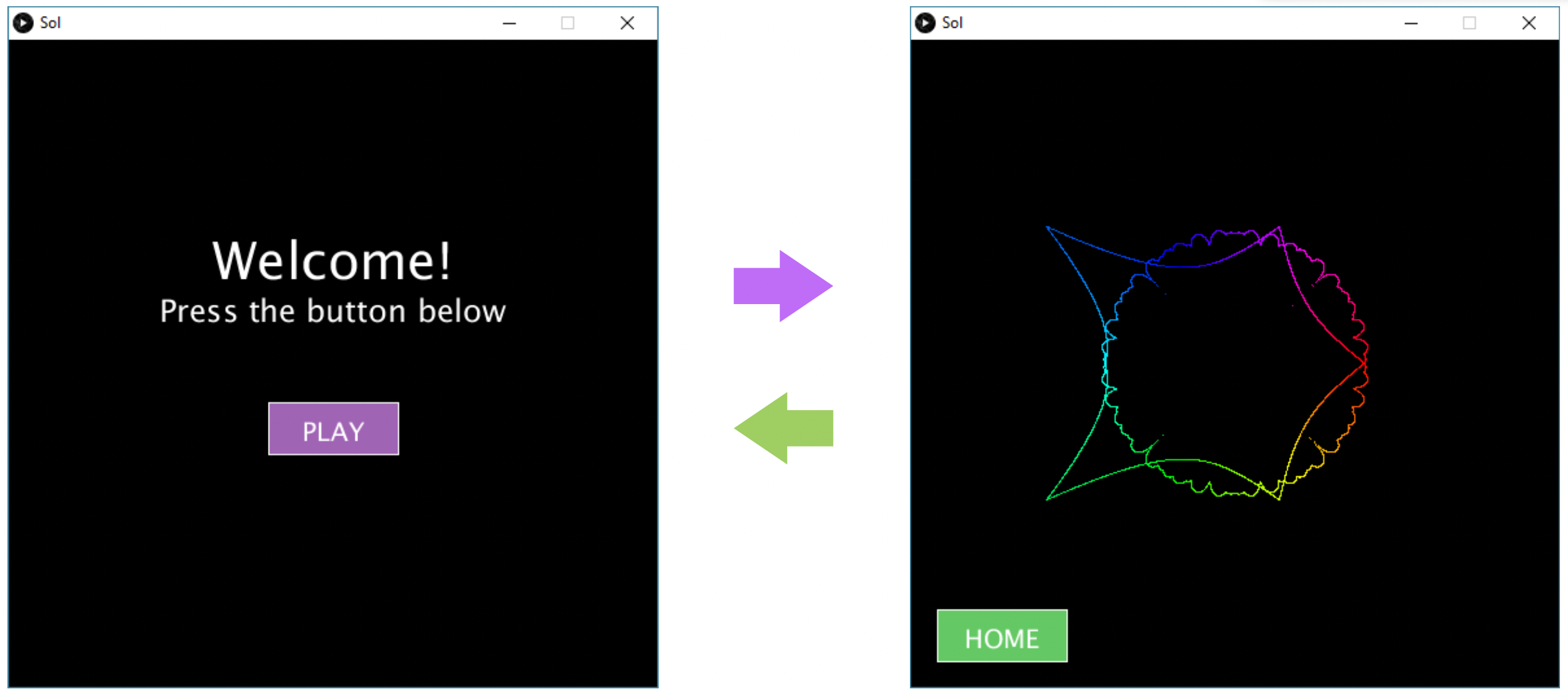 Switching scenes is done by clicking a button on the sketch in each scene. That is, clicking the PLAY button on the home screen takes you to the second scene, and clicking the HOME button in the second scene takes you back to the home screen (see the figure below). Hint: we have seen how to do this in the “Conditionals” lecture.