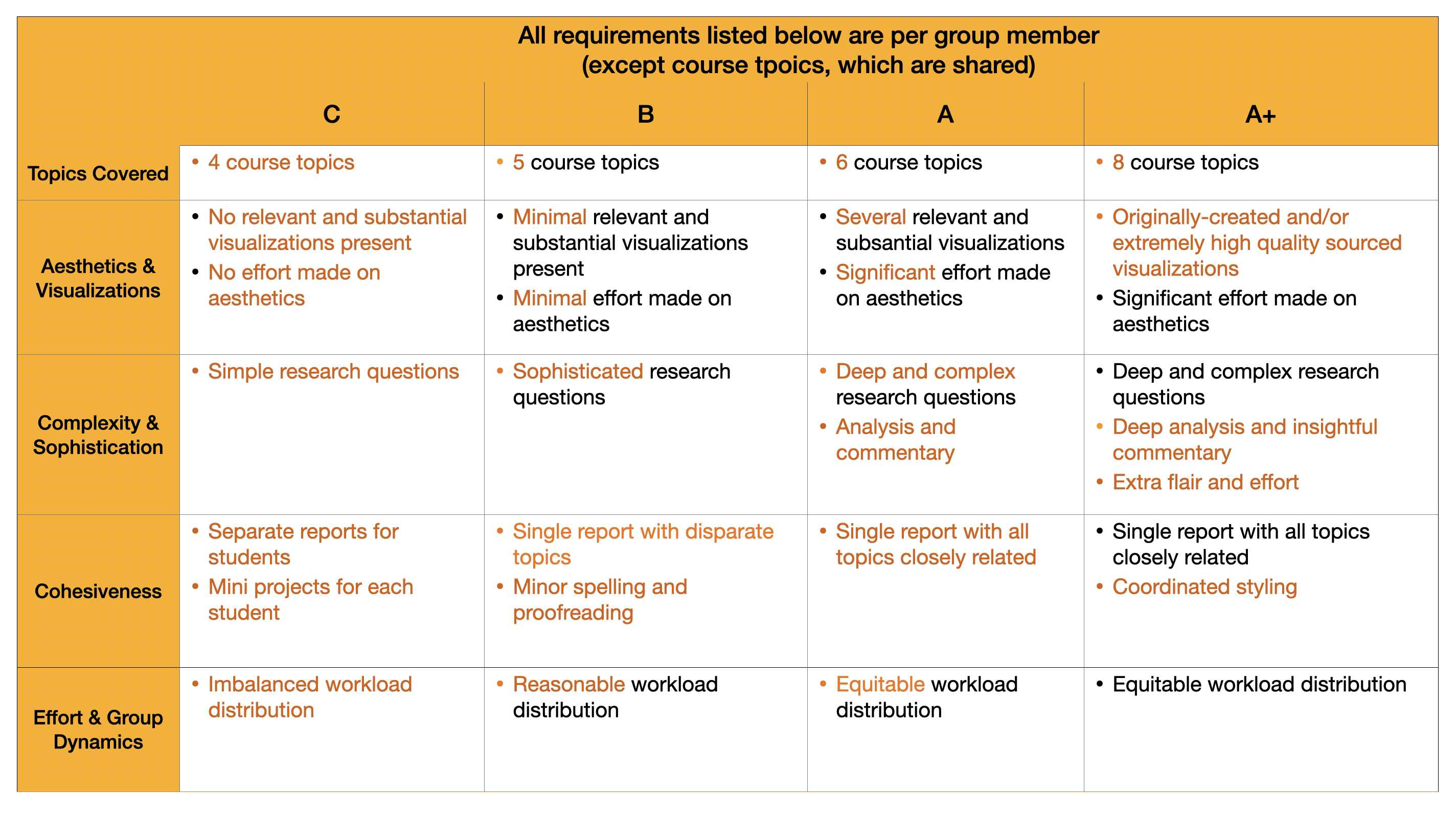 Note that we are looking for meaningful and substantial exploration of the project category you chose (1 of 5) linking back to the course topics you choose from the list above (based on your contracted grade).