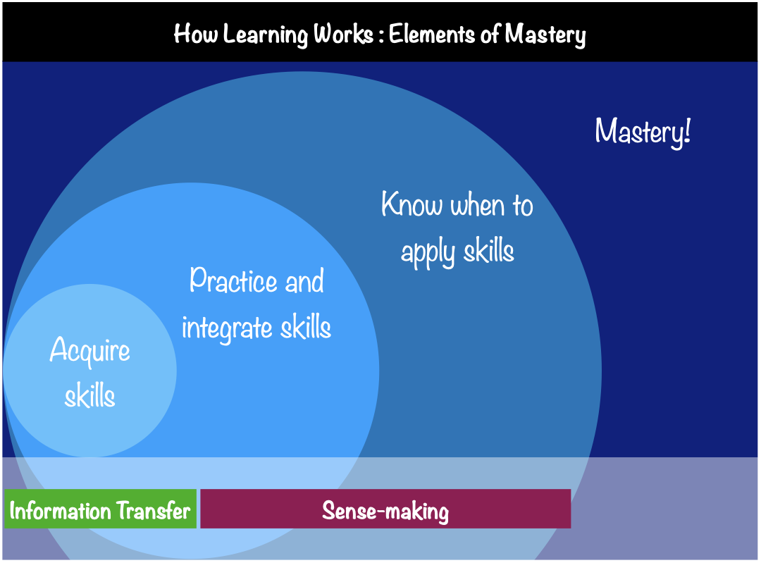Fig. 1 To develop mastery in a concept, students must first acquire the necessary skills, then practice integrating them, and finally know when to apply what they have learned. This figure was adapted from Figure 4.1 of the book “How Learning Works”. The terms “knowledge transfer” and “sense-making” applied in this context is generally attributed to Dr. Eric Mazur.¶